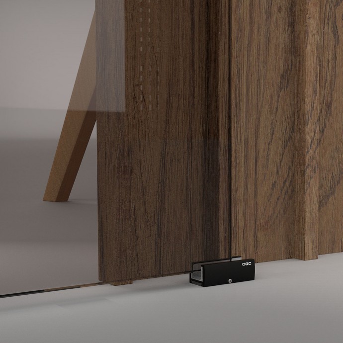 Fabricado en aluminio anodizado 15 µ. Dispone de 3 piezas de nylon gris para los diferentes gruesos de vidrio. Instalación que facilita su montaje con la hoja de vidrio ya colgada en la guía corredera.