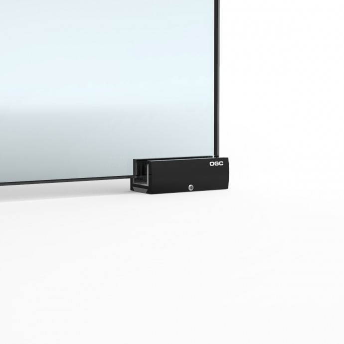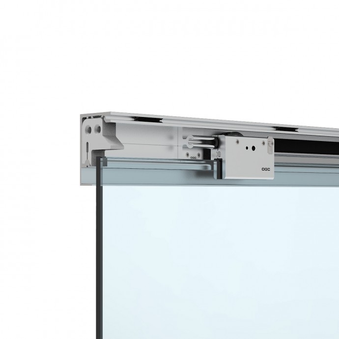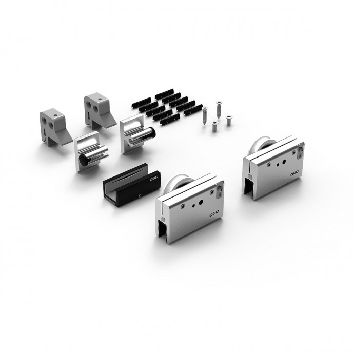 Set completo de accesorios con capacidad de carga de 50kg., para puertas correderas de vidrio que incluye 2 mordazas regulables con sujeción por presión, juego de 2 topes, juego de 2 soportes, 1 guiador de suelo y 10 clips para instalar tapeta embellecedora frontal.