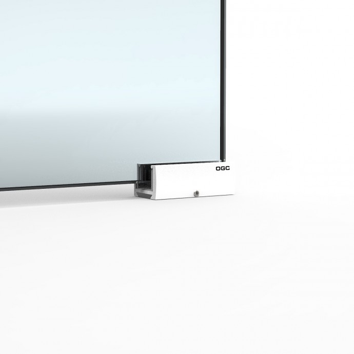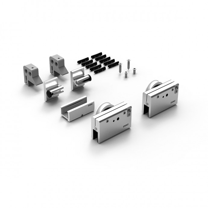 Set completo de accesorios con capacidad de carga de 50kg., para puertas correderas de vidrio que incluye 2 mordazas regulables con sujeción por presión, juego de 2 topes, juego de 2 soportes, 1 guiador de suelo y 10 clips para instalar tapeta embellecedora frontal.