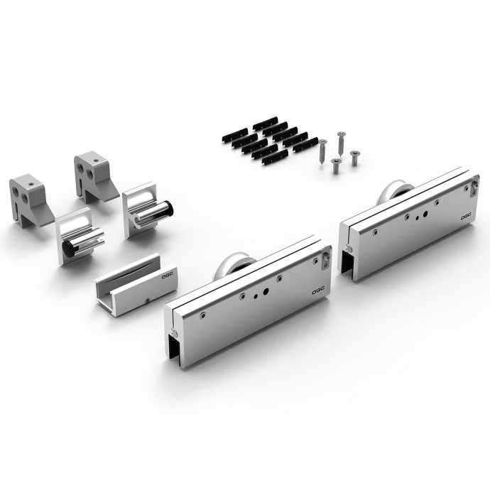 Set completo de accesorios con capacidad de carga de 90kg., para puertas correderas de vidrio que incluye 2 mordazas regulables con sujeción por presión, juego de 2 topes, juego de 2 soportes, 1 guiador de suelo y 10 clips para instalar tapeta embellecedora frontal.