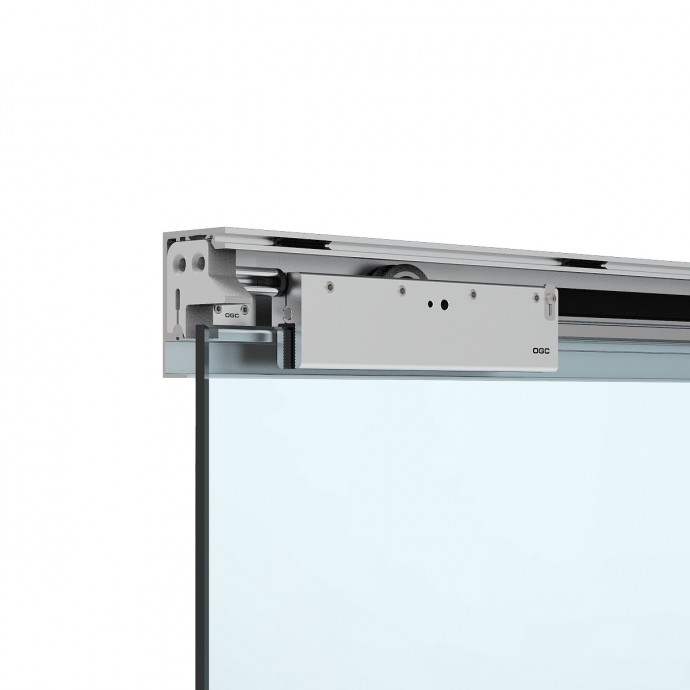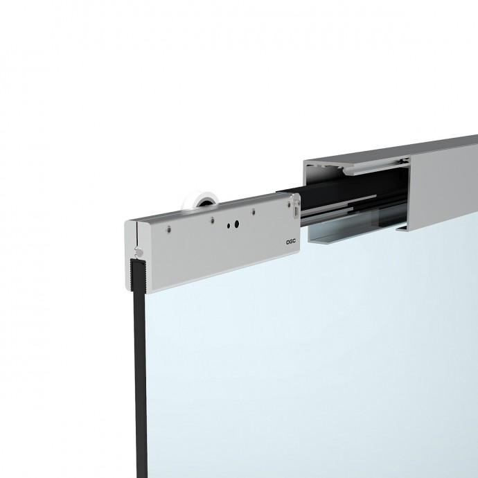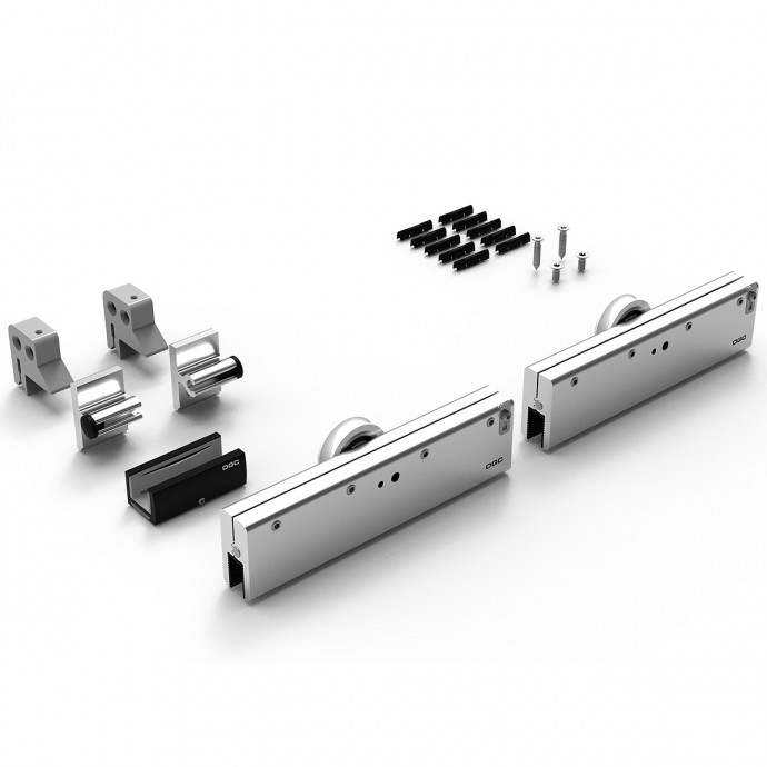 Set completo de accesorios con capacidad de carga de 125kg., para puertas correderas de vidrio que incluye 2 mordazas regulables con sujeción por presión, juego de 2 topes, juego de 2 soportes, 1 guiador de suelo y 10 clips para instalar tapeta embellecedora frontal.