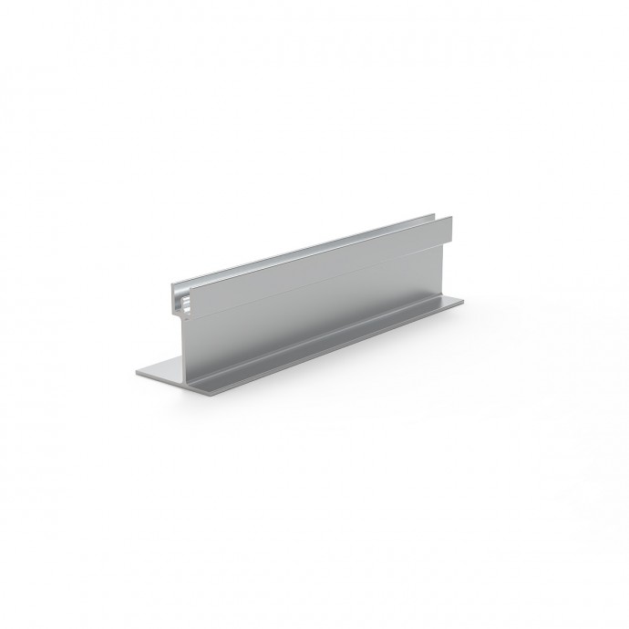 Perfil fabricado en aluminio con acabado lacado 15 µ. plata mate. Tapeta embellecedora registrable mediante clipaje con clips ELEVA. Sistema idóneo para proyectar instalaciones con herraje oculto y predominio de los paneles de vidrio que surgen desde el techo, ofreciendo una estética altamente liviana y ligera.