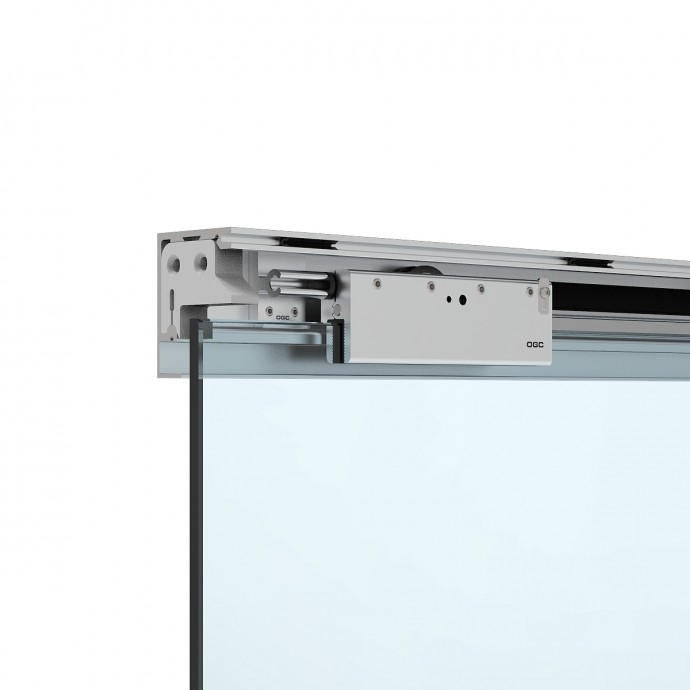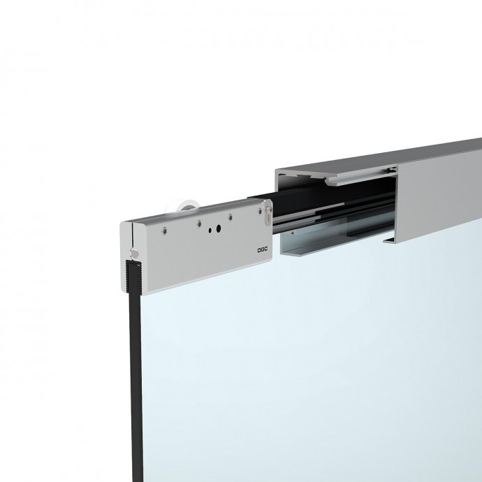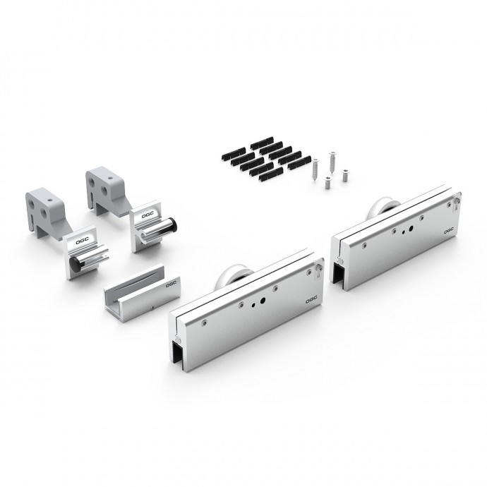 Set completo de accesorios con capacidad de carga de 90kg., para puertas correderas de vidrio que incluye 2 mordazas regulables con sujeción por presión, juego de 2 topes, juego de 2 soportes, 1 guiador de suelo y 10 clips para instalar tapeta embellecedora frontal.