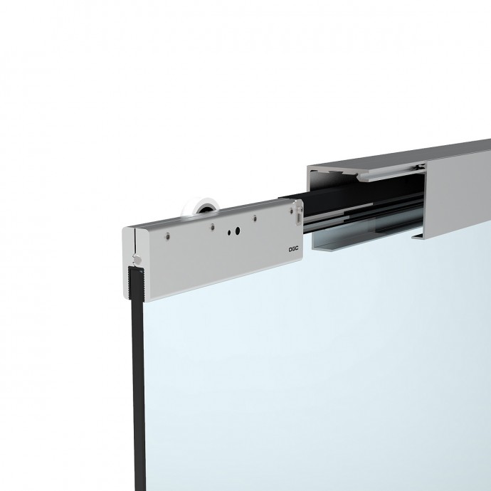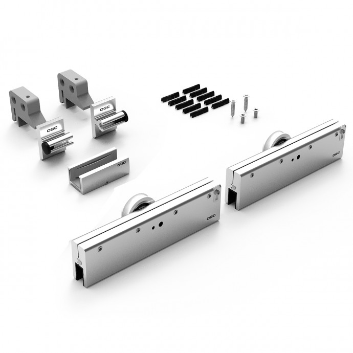 Set completo de accesorios con capacidad de carga de 125kg., para puertas correderas de vidrio que incluye 2 mordazas regulables con sujeción por presión, juego de 2 topes, juego de 2 soportes, 1 guiador de suelo y 10 clips para instalar tapeta embellecedora frontal.