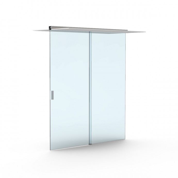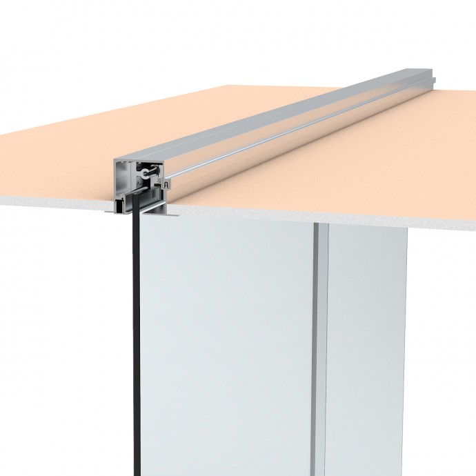 Perfil fabricado en aluminio con acabado lacado 15 µ. plata mate. Guía con ubicación para fijo compacta para instalación con falsos techos, lo que hace de el que se puedan proyectar instalaciones con herraje oculto y predominio de los paneles de vidrio que surgen desde el techo, ofreciendo una estética altamente liviana y ligera.