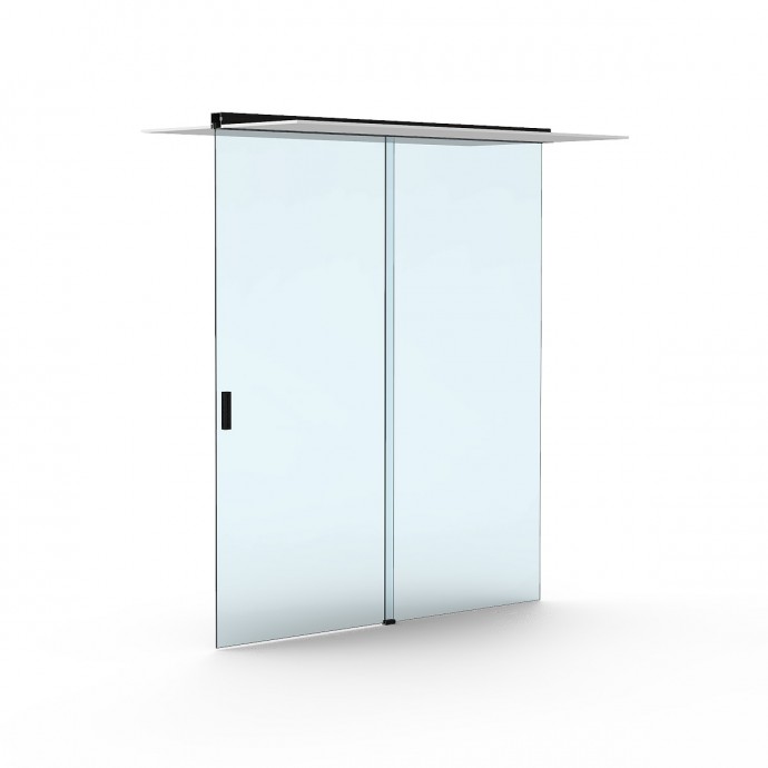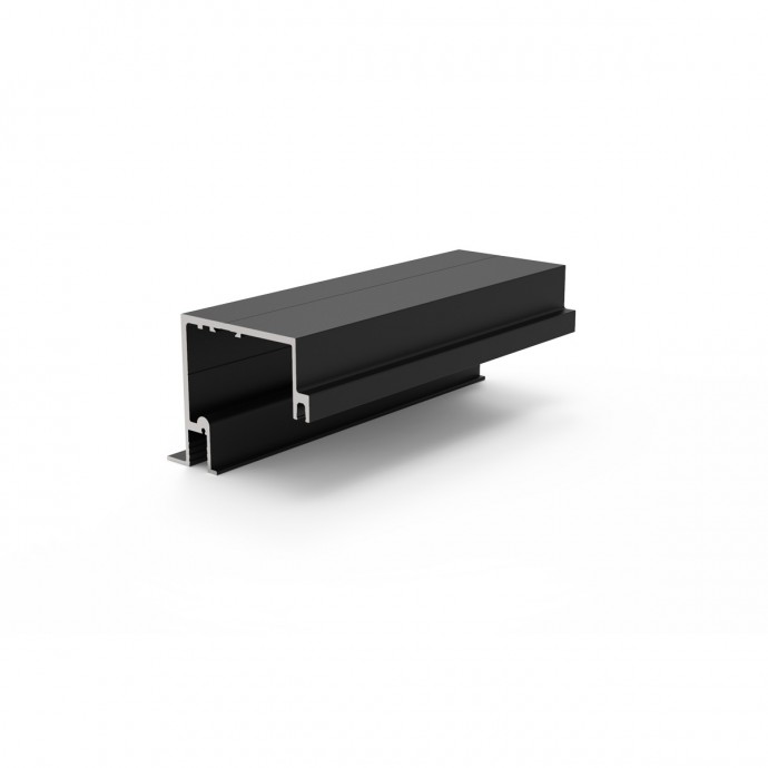 Perfil fabricado en aluminio con acabado lacado 15 µ. plata mate. Guía con ubicación para fijo compacta para instalación con falsos techos, lo que hace de el que se puedan proyectar instalaciones con herraje oculto y predominio de los paneles de vidrio que surgen desde el techo, ofreciendo una estética altamente liviana y ligera.